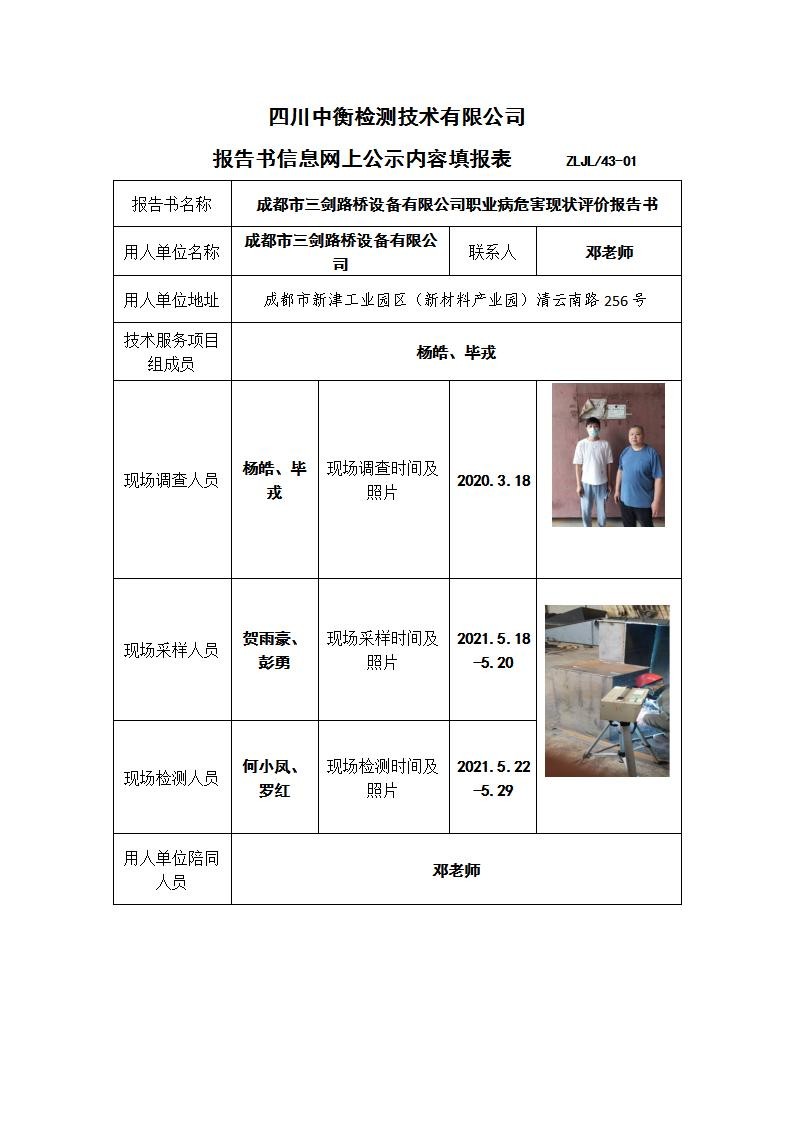 成都市三劍路橋設備有限公司職業病危害現狀評價報告書
