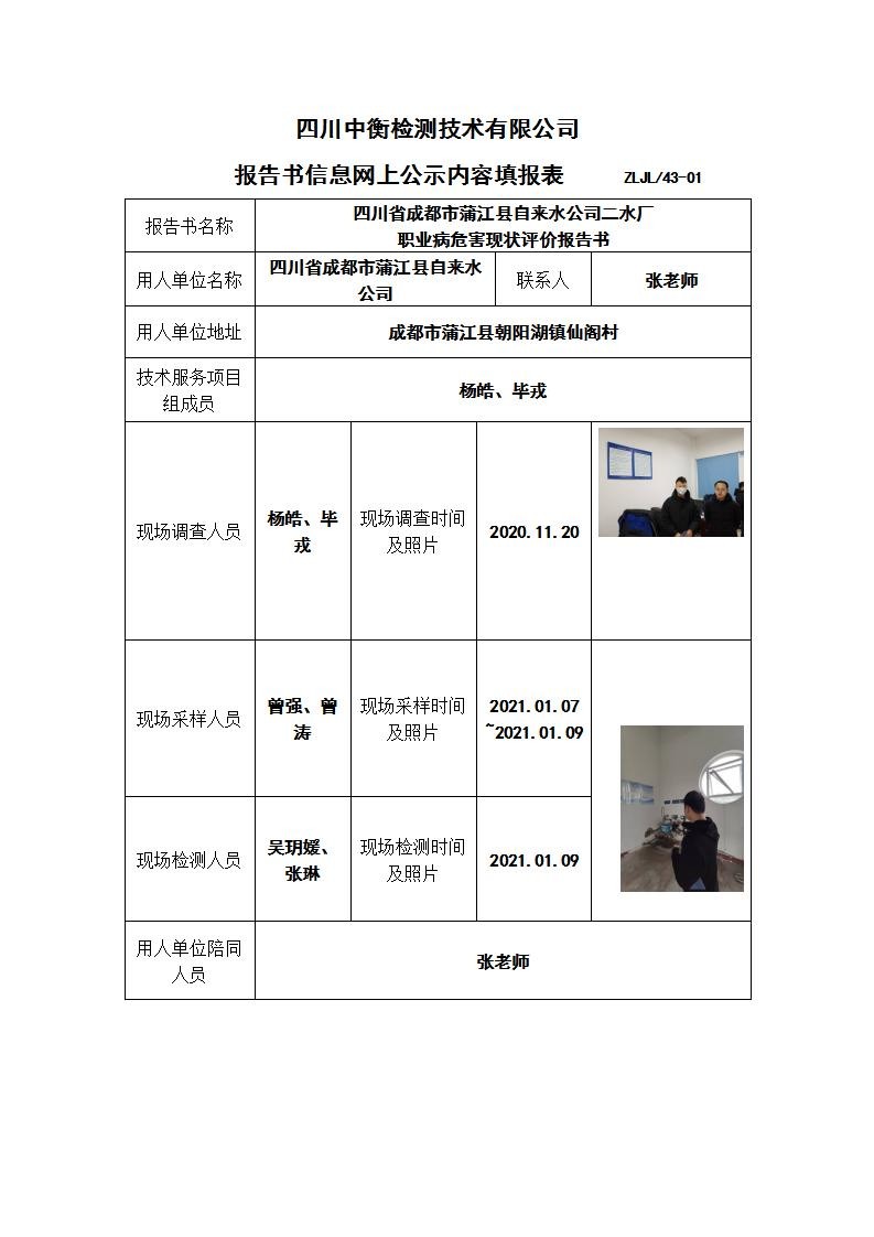 四川省成都市蒲江縣自來水公司二水廠 職業病危害現狀評價