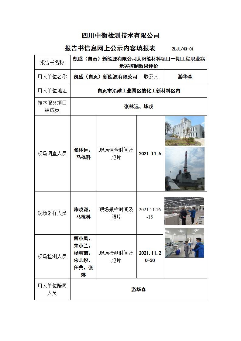 凱盛(自貢)新能源有限公司太陽能材料項目一期工程職業病危害控制效果評價