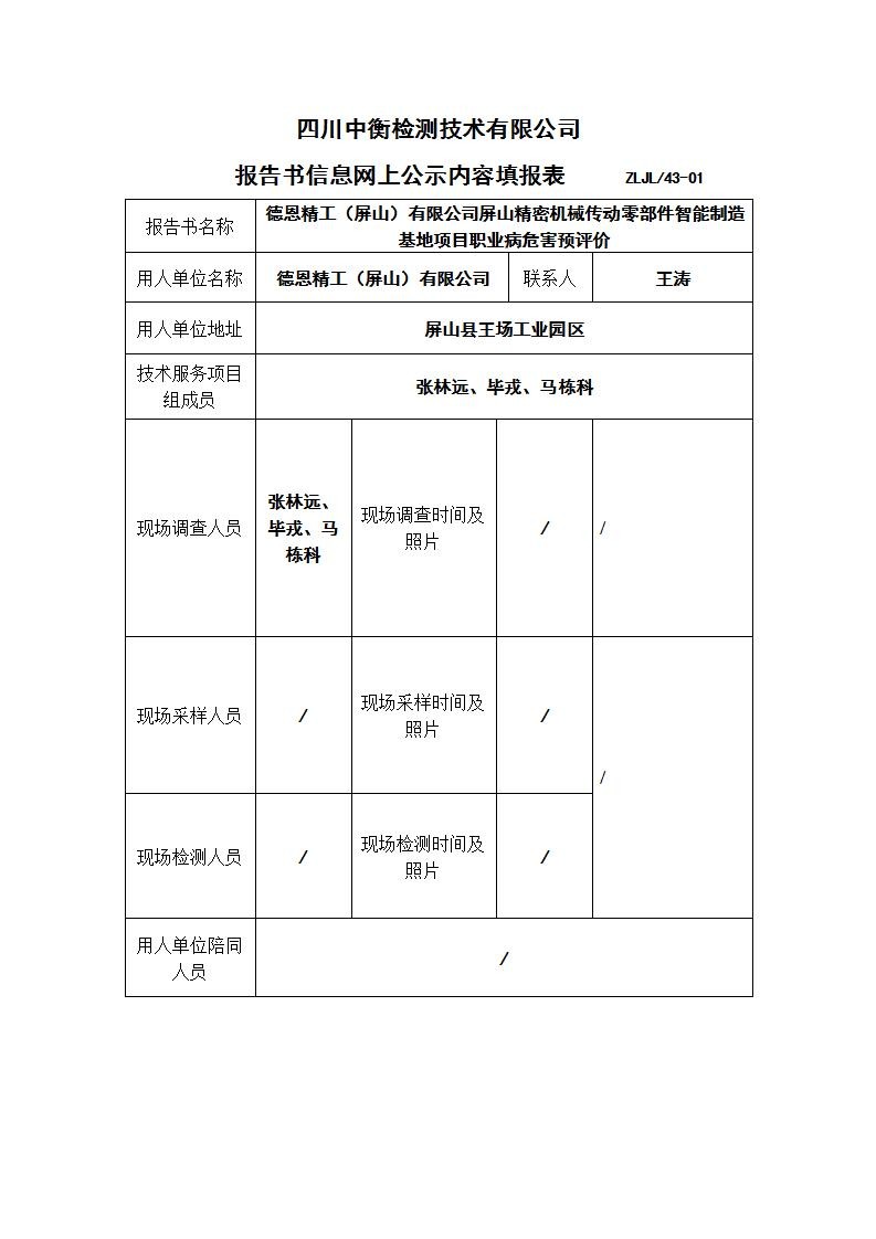 德恩精工(屏山)有限公司屏山精密機械傳動零部件智能制造基地項目職業病危害預評價