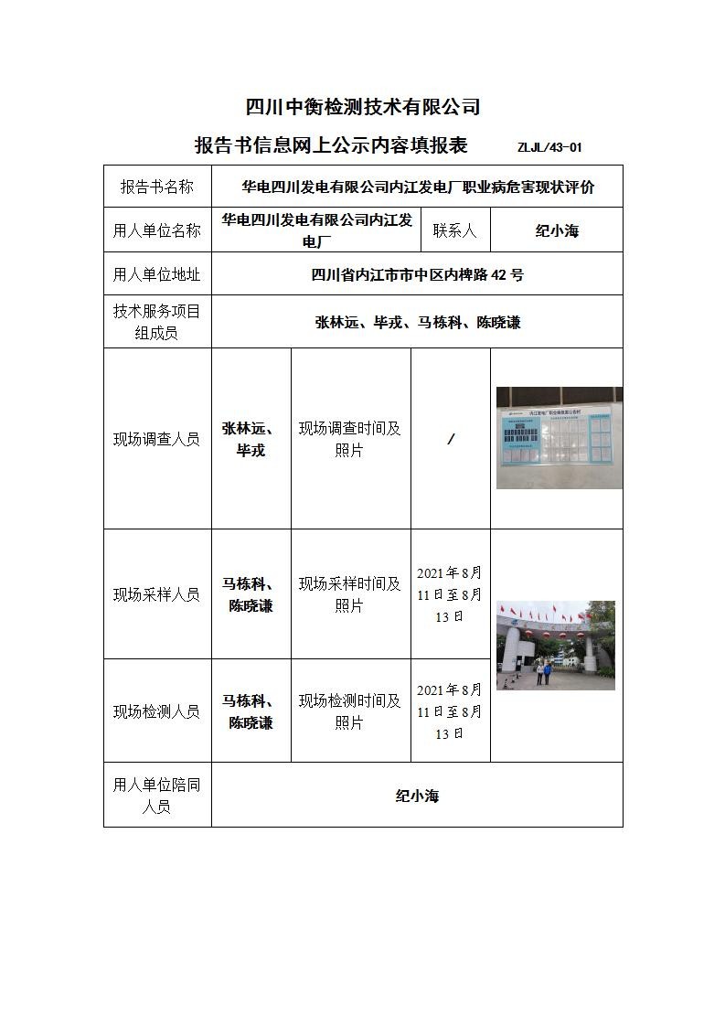 華電四川發電有限公司內江發電廠職業病危害現狀評價