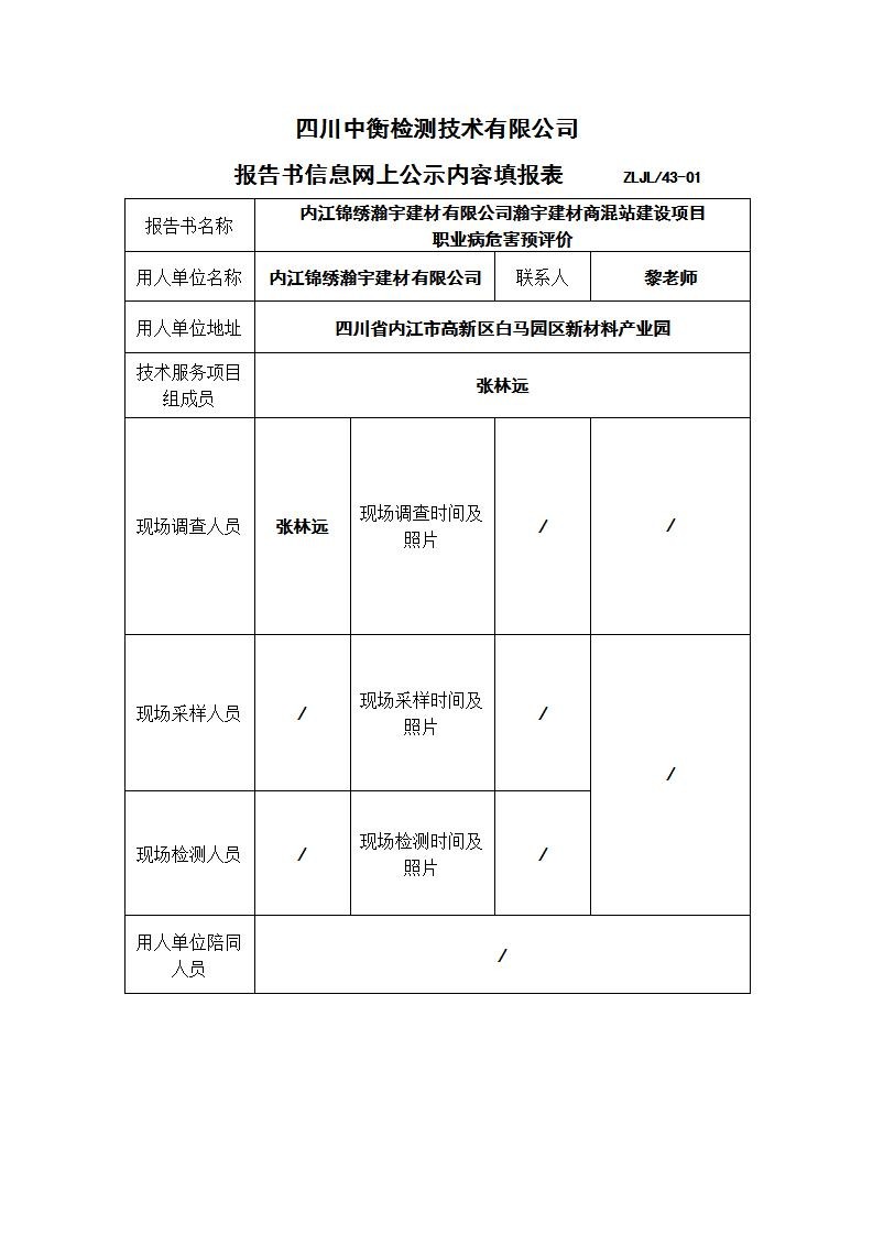內江錦繡瀚宇建材有限公司瀚宇建材商混站建設項目 職業病危害預評價