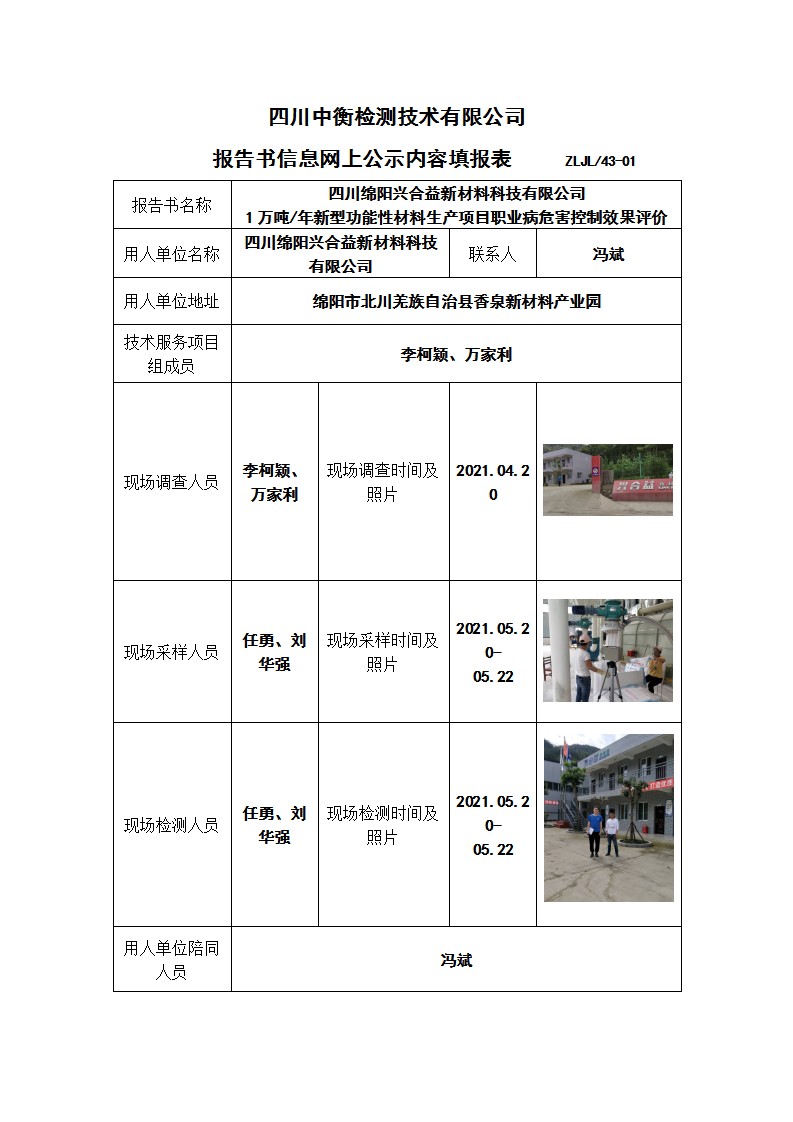 四川綿陽興合益新材料科技有限公司 1萬噸/年新型功能性材料生產項目職業病危害控制效果評價