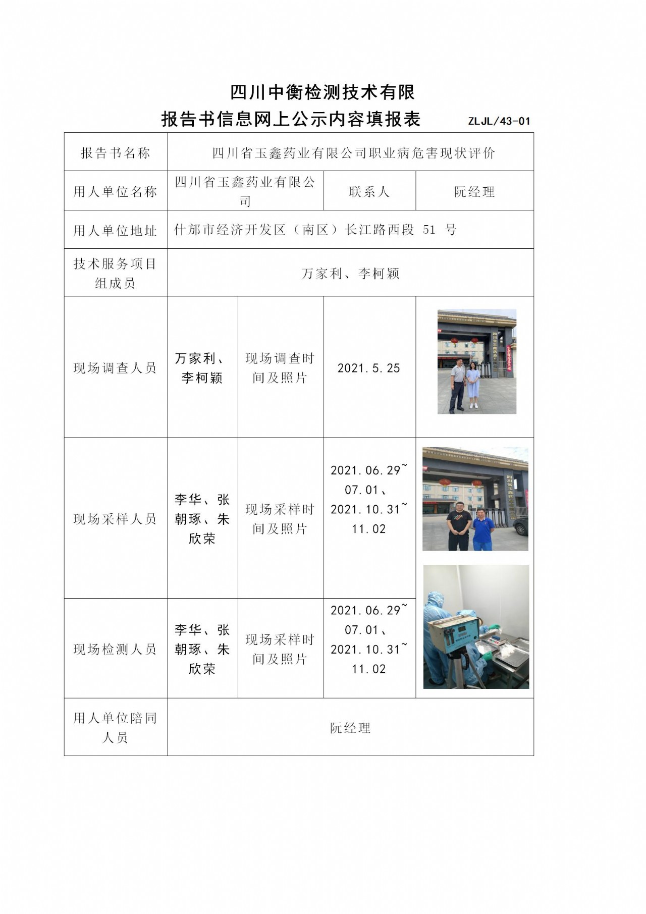 四川省玉鑫藥業有限公司職業病危害現狀評價