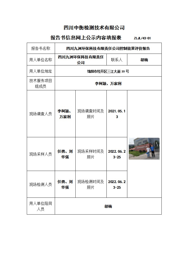 四川九洲環保科技有限責任公司控制效果評價報告