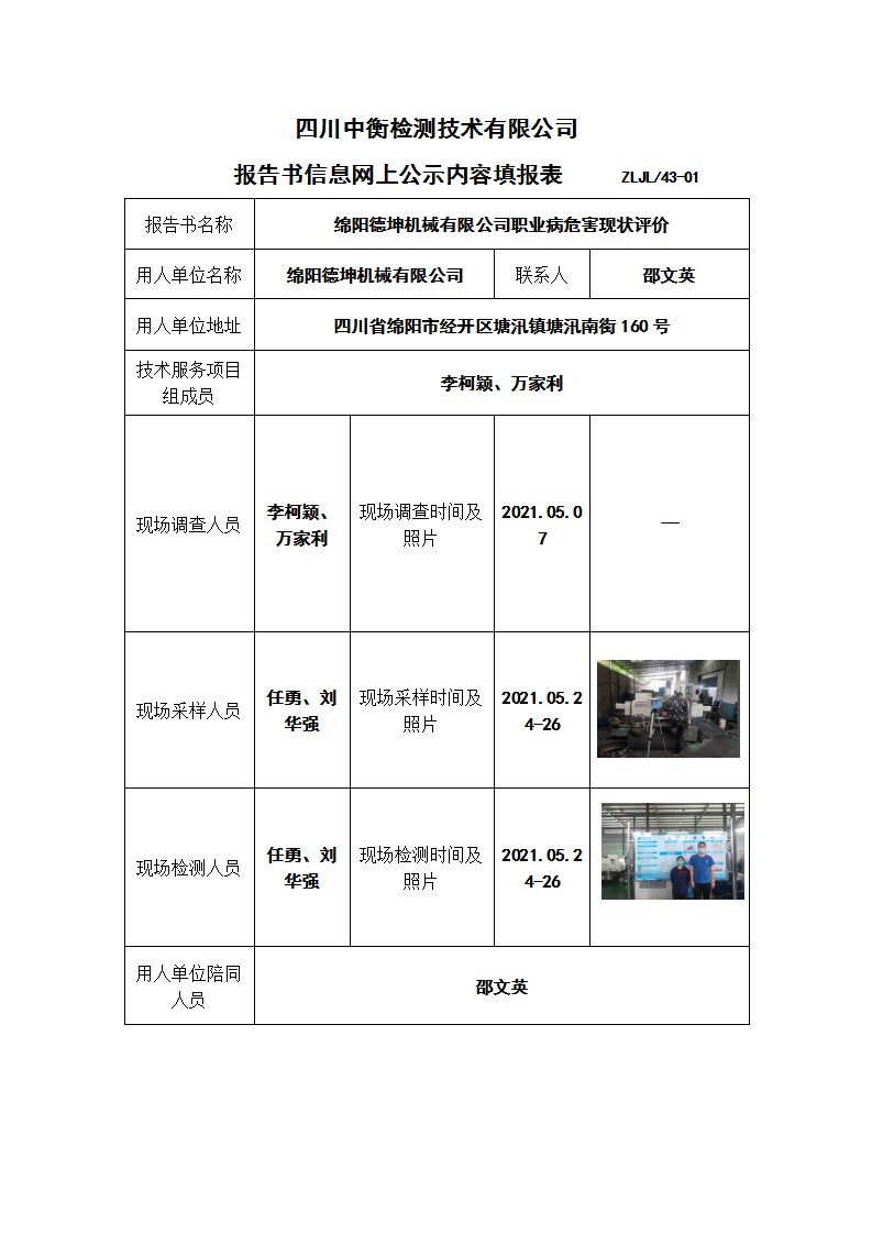綿陽德坤機械有限公司職業病危害現狀評價