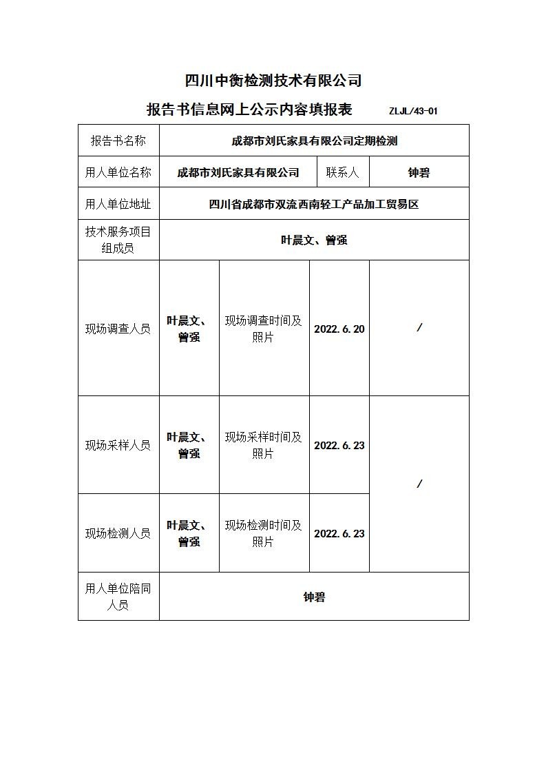 成都市劉氏家具有限公司職業病危害定期檢測