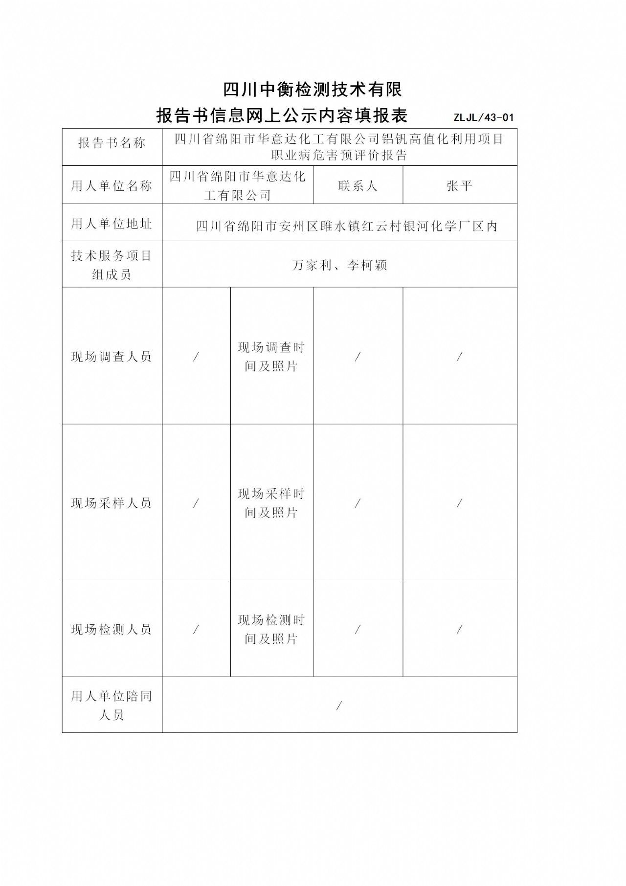 四川省綿陽市華意達化工有限公司鋁釩高值化利用項目職業病危害預評價報告