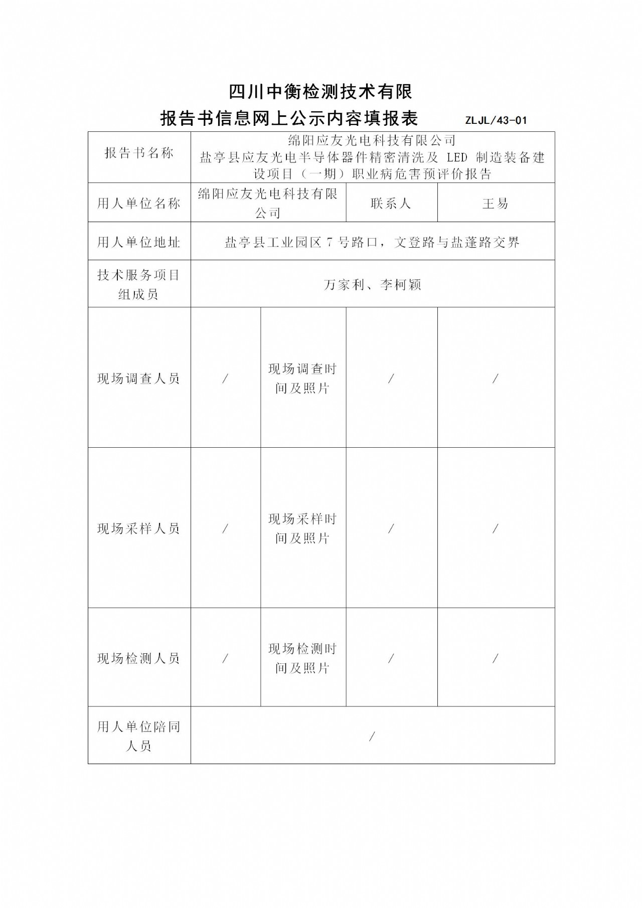 綿陽(yáng)應(yīng)友光電科技有限公司 鹽亭縣應(yīng)友光電半導(dǎo)體器件精密清洗及 LED 制造裝備建設(shè)項(xiàng)目(一期)職業(yè)病危害預(yù)評(píng)價(jià)