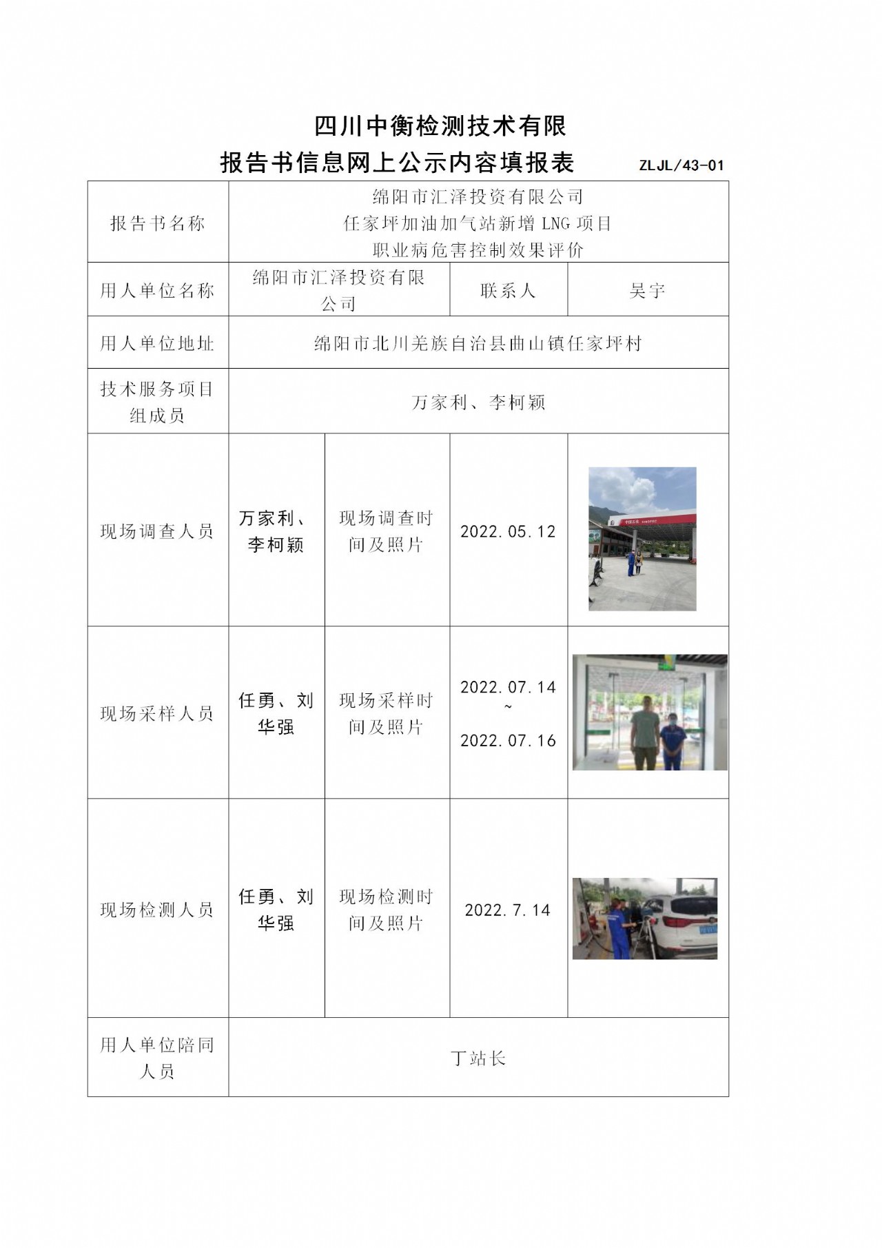 綿陽市匯澤投資有限公司 任家坪加油加氣站新增LNG項目 職業病危害控制效果評價