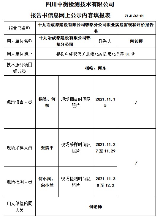 十九冶成都建設有限公司郫都分公司職業病危害現狀評價
