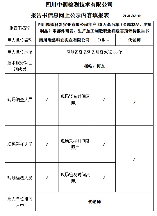 四川隆盛科發(fā)實業(yè)有限公司年產(chǎn)30萬套汽車(金屬制品、注塑制品)零部件研發(fā)、生產(chǎn)加工制造職業(yè)病危害預(yù)評價