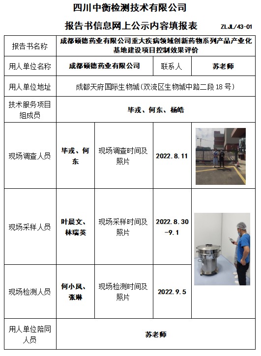 成都碩德藥業有限公司重大疾病領域創新藥物系列產品產業化基地建設項目控制效果評價