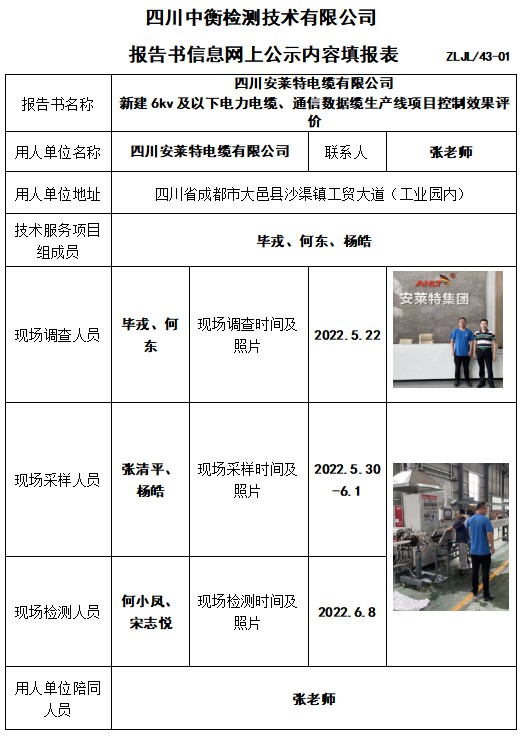 四川安萊特電纜有限公司 新建6kv及以下電力電纜、通信數據纜生產線項目控制效果評價