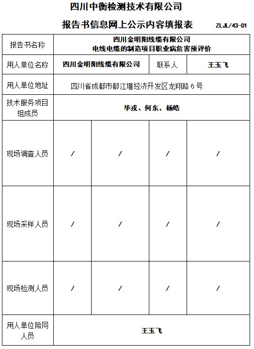 四川金明陽線纜有限公司 電線電纜的制造項目職業病危害預評價