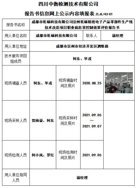 成都市乾碩科技有限公司崇州乾碩精密電子產(chǎn)品零部件生產(chǎn)線技術(shù)改造項目職業(yè)病危害控制效果評價