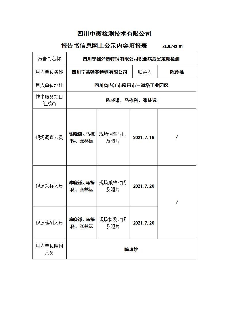 四川寧鑫彈簧特鋼有限公司職業病危害定期檢測