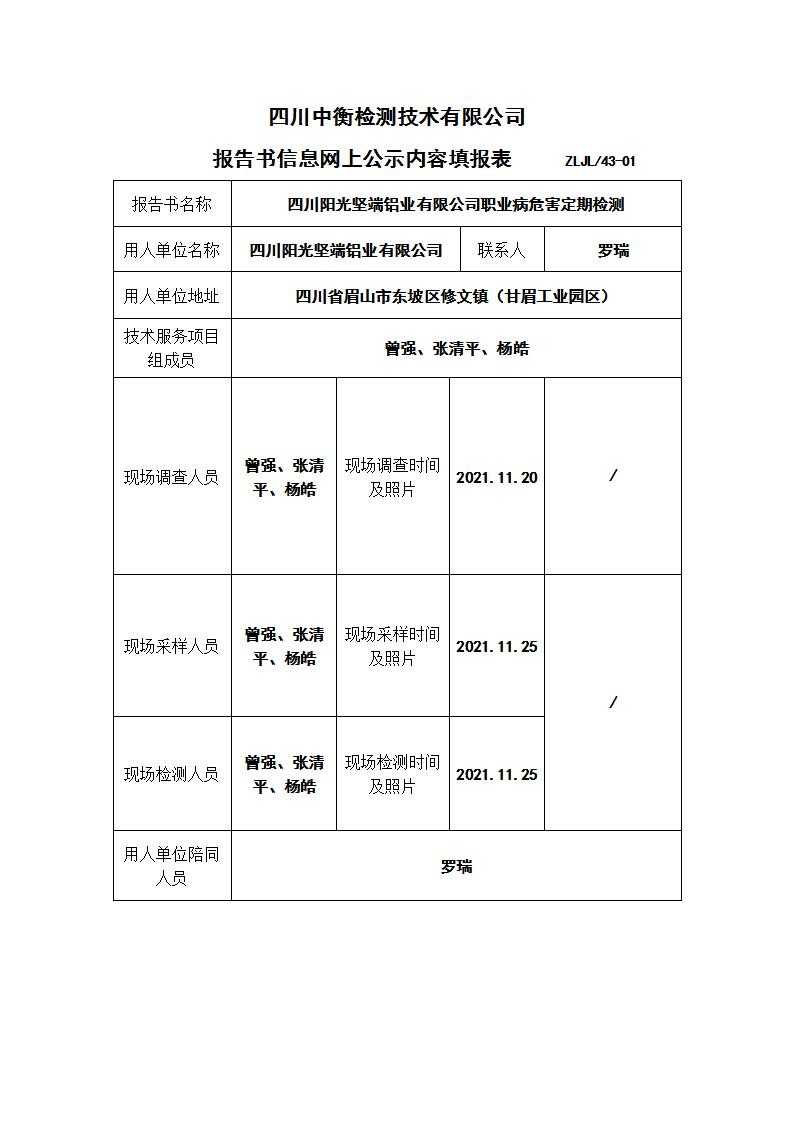四川陽光堅端鋁業有限公司職業病危害定期檢測