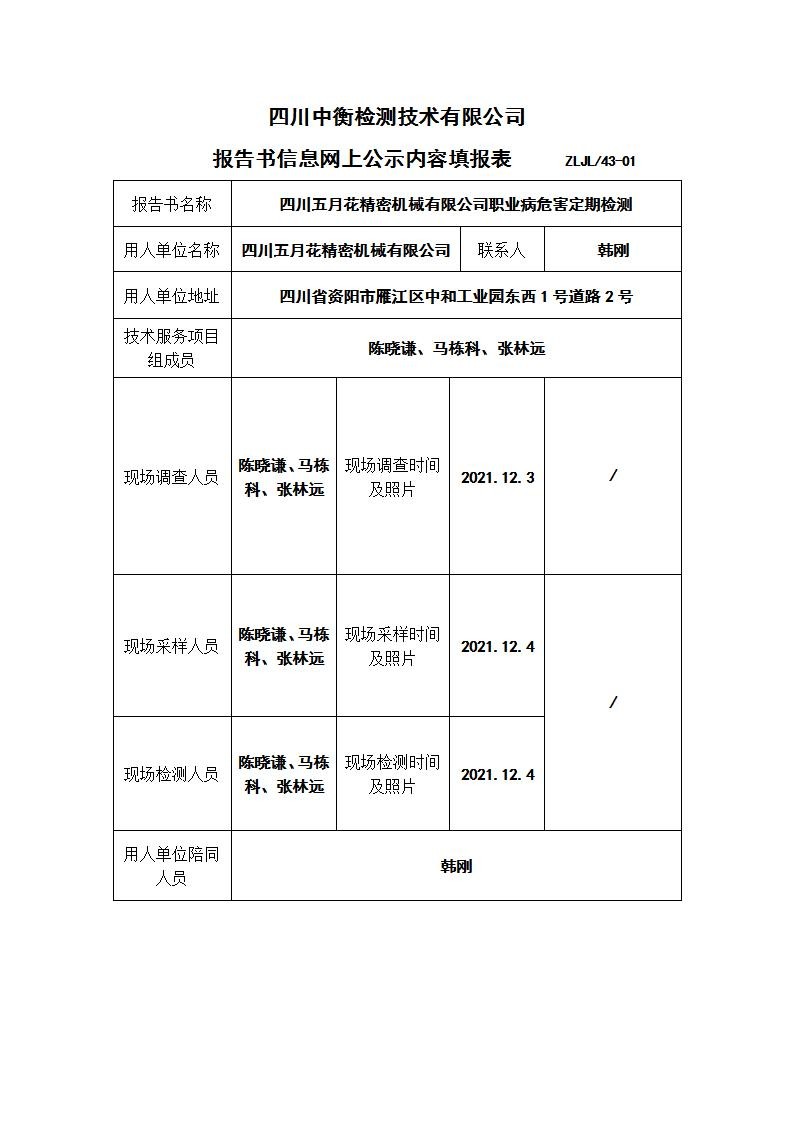 四川五月花精密機械有限公司職業病危害定期檢測