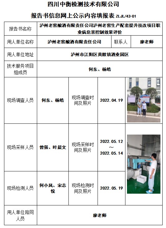 瀘州老窖釀酒有限責任公司瀘州老窖生產配套提升技改項目職業病危害控制效果評價