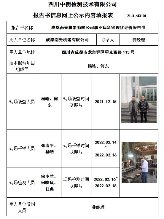 成都南光機(jī)器有限公司職業(yè)病危害現(xiàn)狀評價(jià)