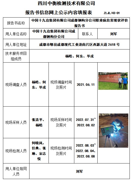 中國十九冶集團有限公司成都鋼構分公司職業病危害現狀評價