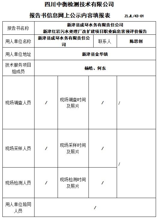 新津縣成環水務有限責任公司 新津紅巖污水處理廠改擴建項目職業病危害預評價