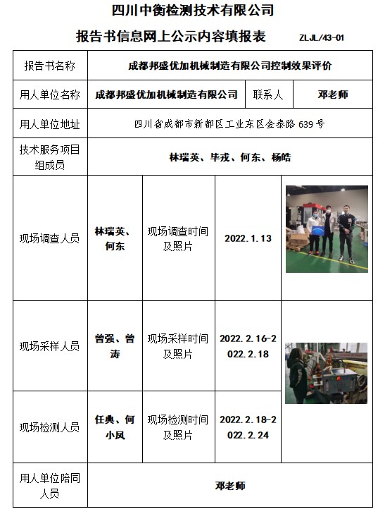 成都邦盛優(yōu)加機械制造有限公司控制效果評價