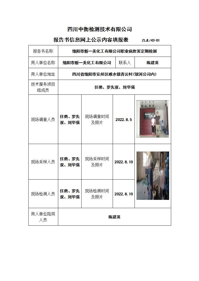 綿陽市新一美化工有限公司職業病危害定期檢測