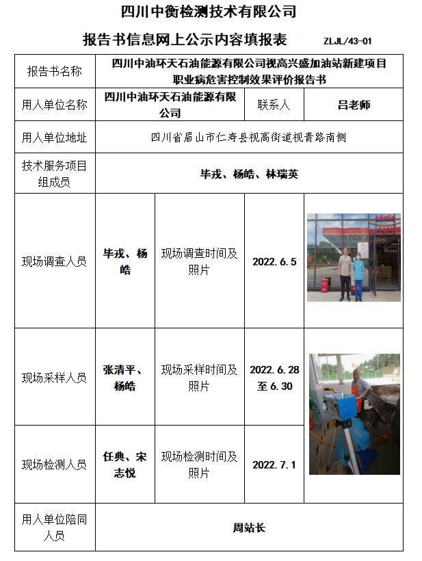 四川中油環天石油能源有限公司視高興盛加油站新建項目 職業病危害控制效果評價