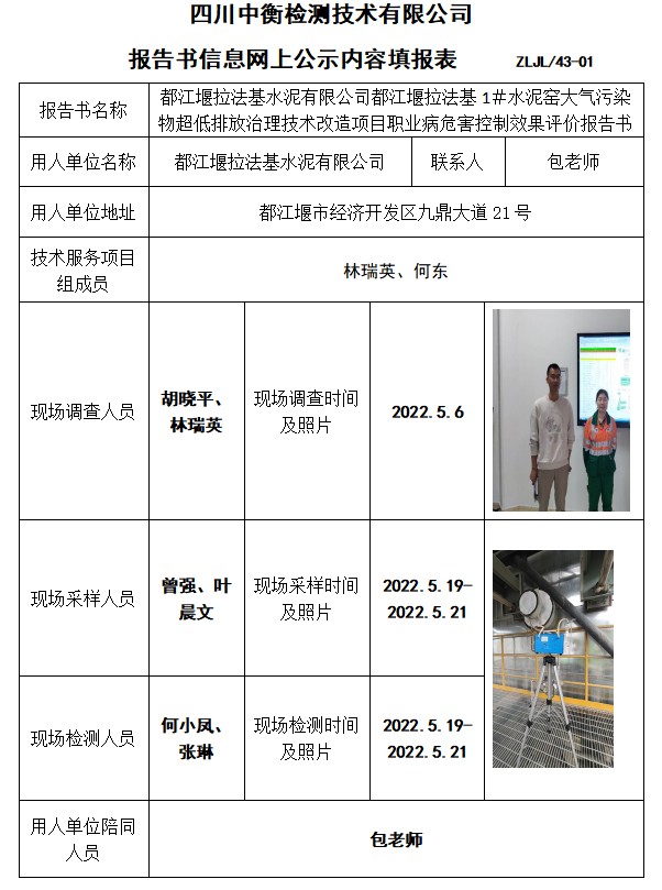 都江堰拉法基水泥有限公司都江堰拉法基1#水泥窯大氣污染物超低排放治理技術改造項目職業病危害控制效果評價