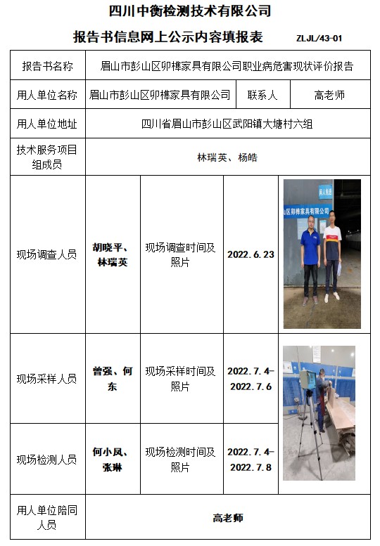 眉山市彭山區(qū)卯榫家具有限公司職業(yè)病危害現(xiàn)狀評價