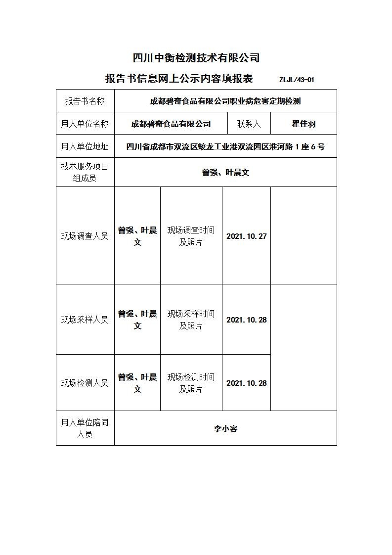 成都碧奇食品有限公司職業病危害定期檢測