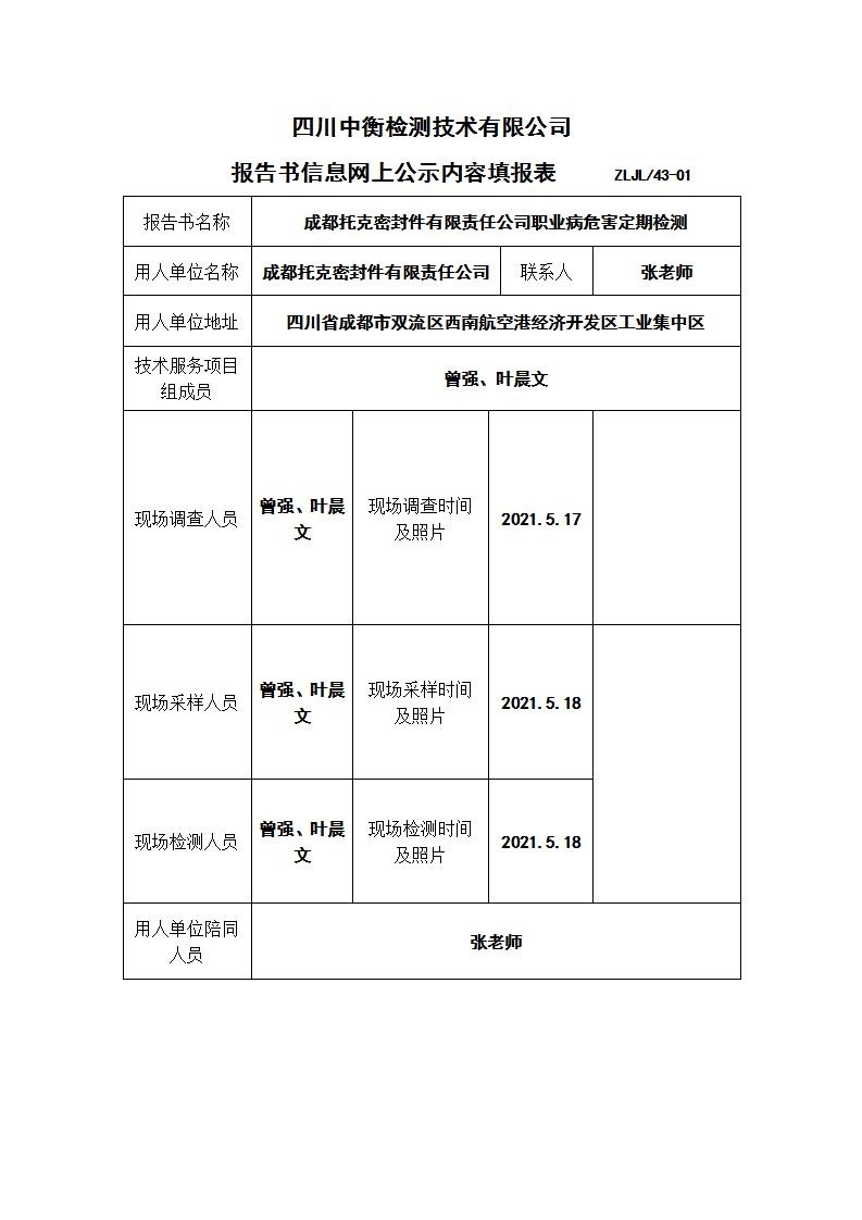 成都托克密封件有限責任公司職業(yè)病危害定期檢測
