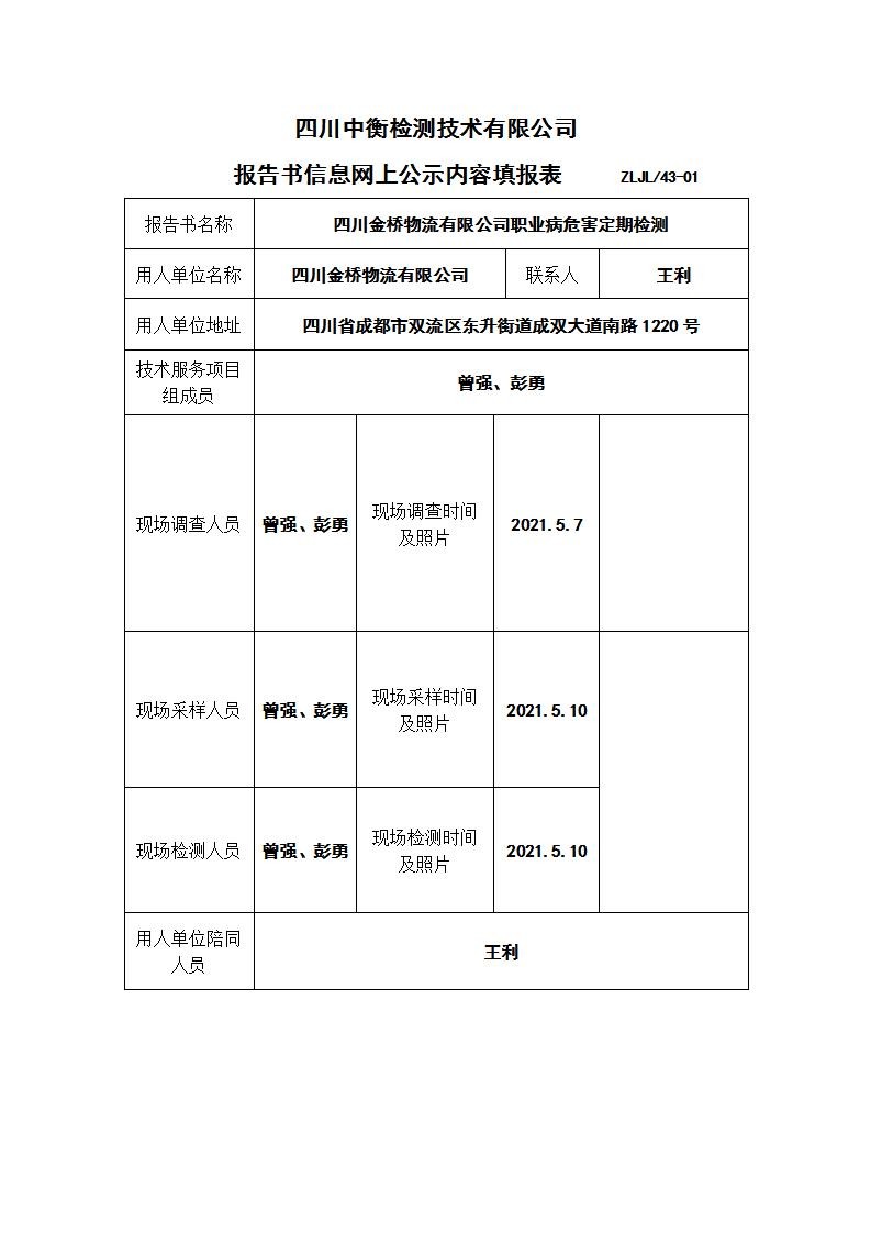 四川金橋物流有限公司職業病危害定期檢測