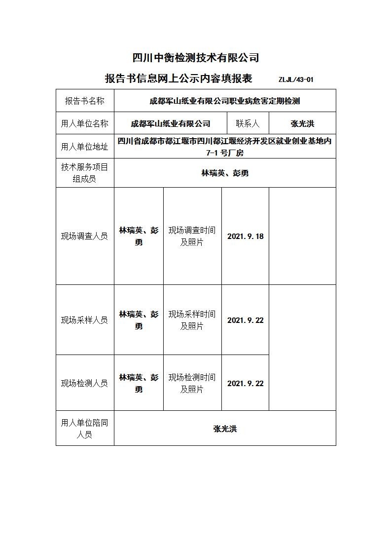 成都軍山紙業有限公司職業病危害定期檢測
