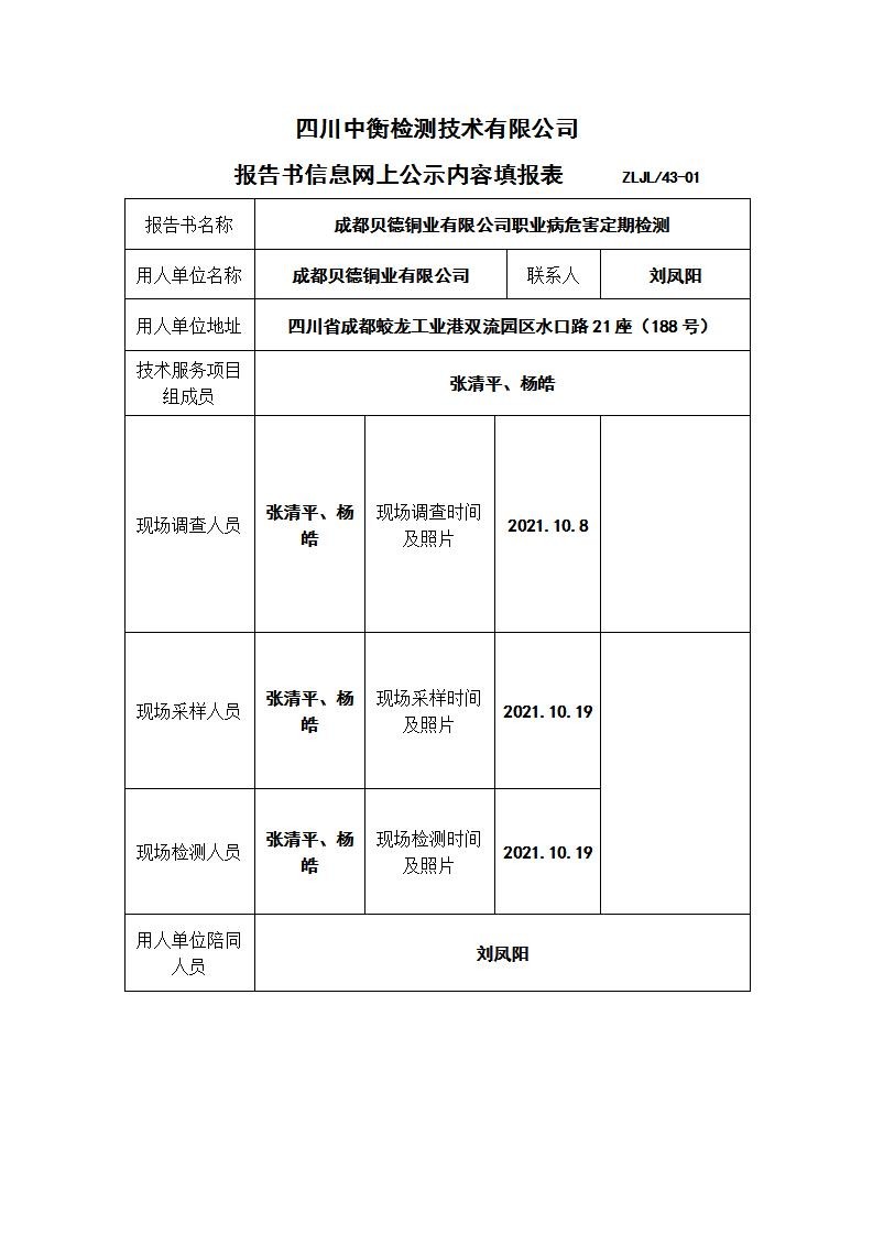 成都貝德銅業有限公司職業病危害定期檢測
