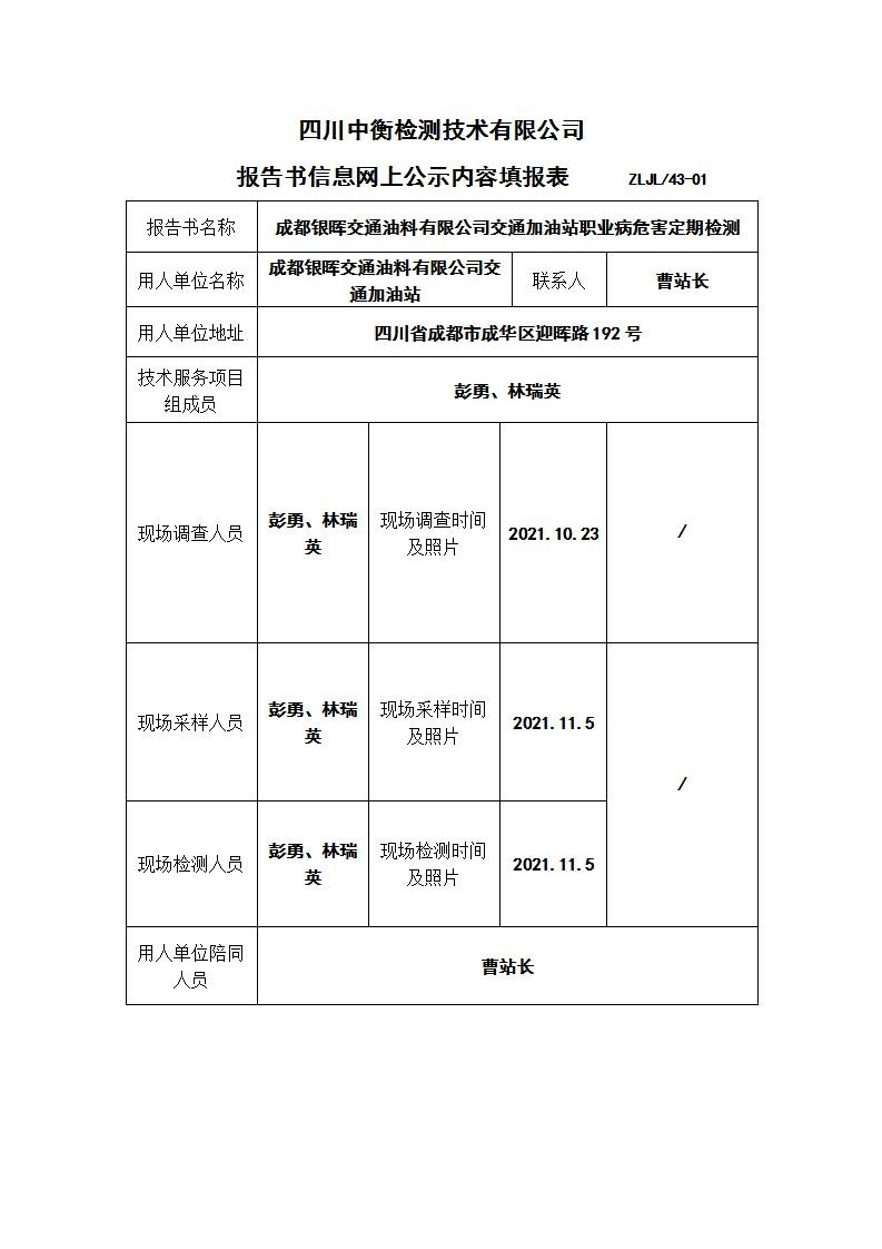 成都銀暉交通油料有限公司交通加油站職業病危害定期檢測