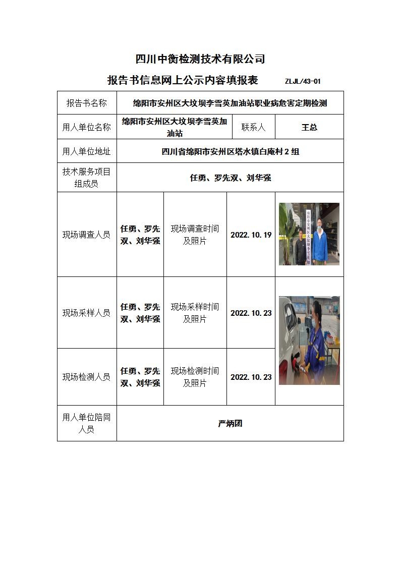 綿陽市安州區大墳壩李雪英加油站職業病危害定期檢測