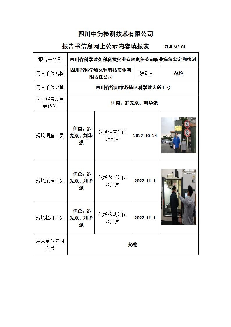 四川省科學城久利科技實業有限責任公司職業病危害定期檢測