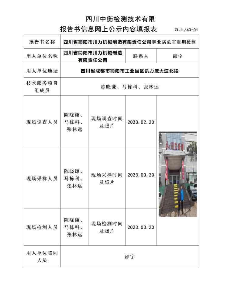四川省簡(jiǎn)陽(yáng)市川力機(jī)械制造有限責(zé)任公司職業(yè)病危害定期檢測(cè)