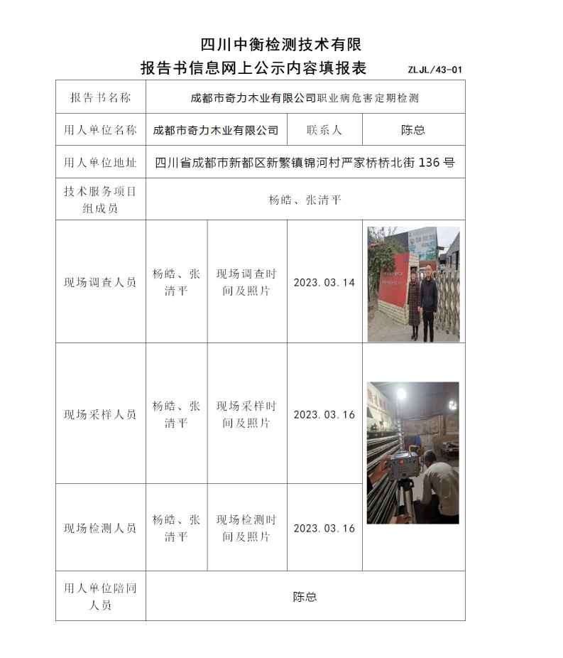 成都市奇力木業有限公司職業病危害定期檢測