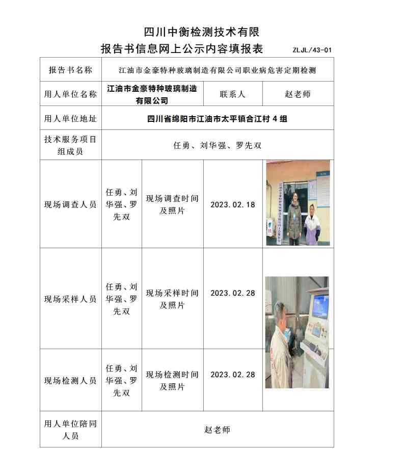 江油市金豪特種玻璃制造有限公司職業病危害定期檢測