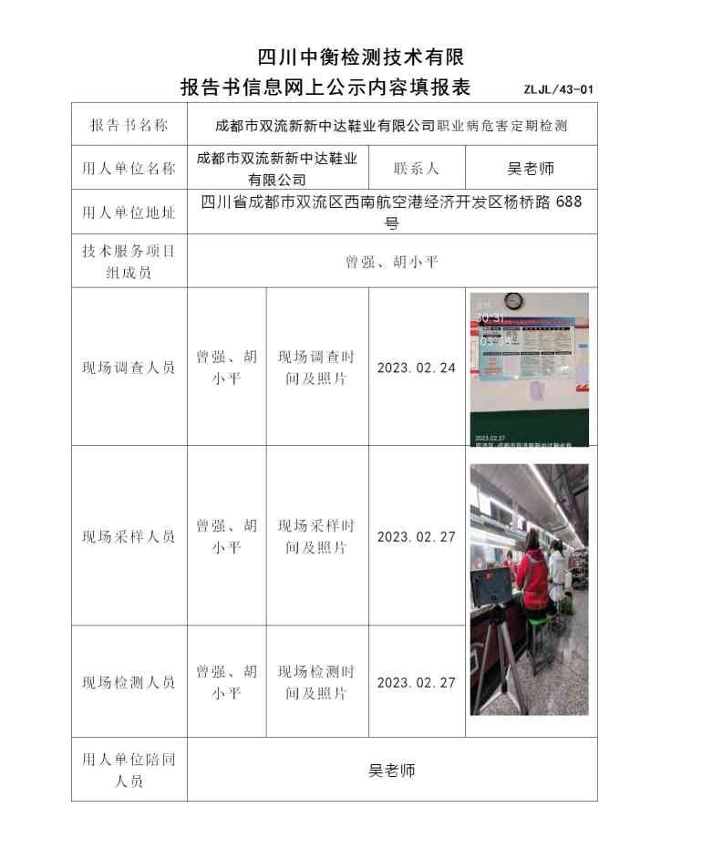 成都市雙流新新中達鞋業有限公司職業病危害定期檢測