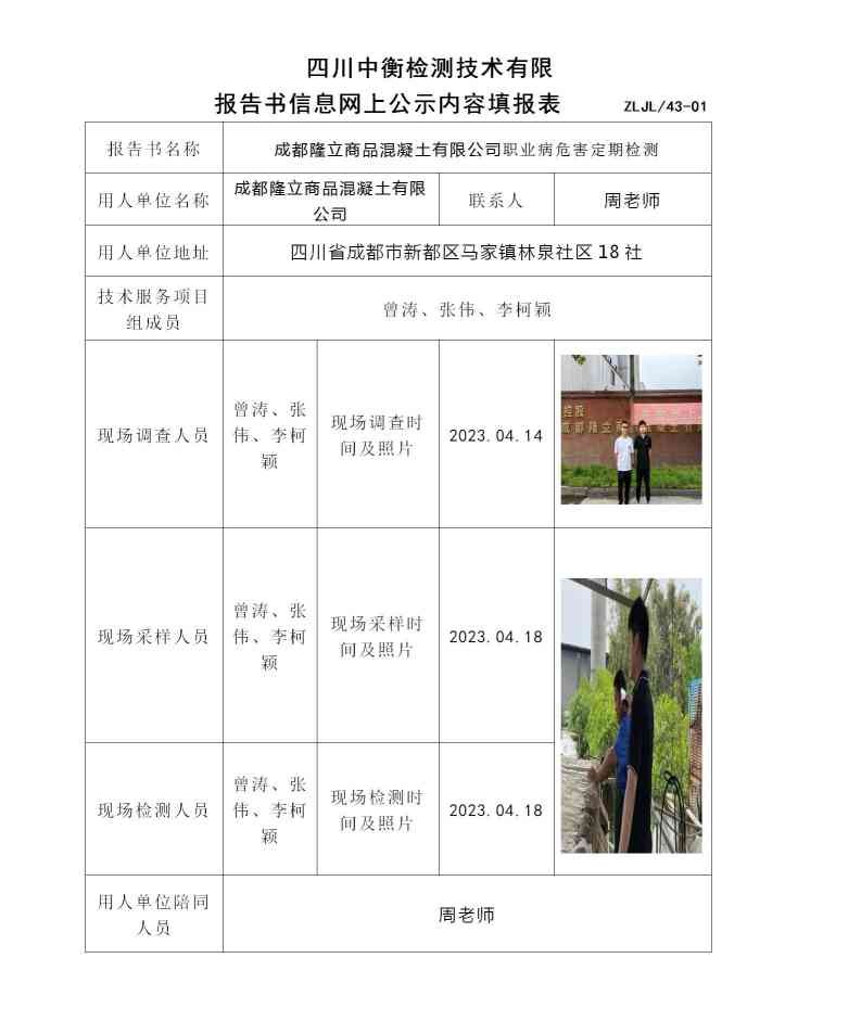 成都隆立商品混凝土有限公司職業病危害定期檢測