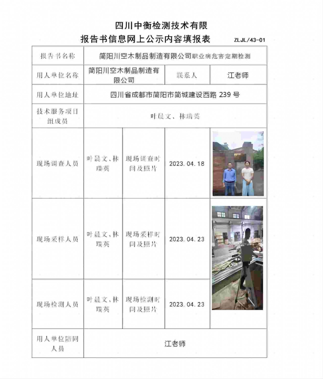 簡(jiǎn)陽(yáng)川空木制品制造有限公司職業(yè)病危害定期檢測(cè)