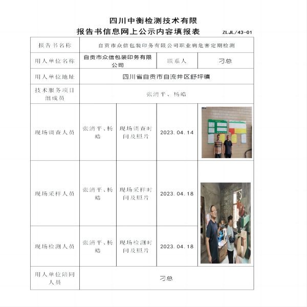 自貢市眾信包裝印務(wù)有限公司職業(yè)病危害定期檢測