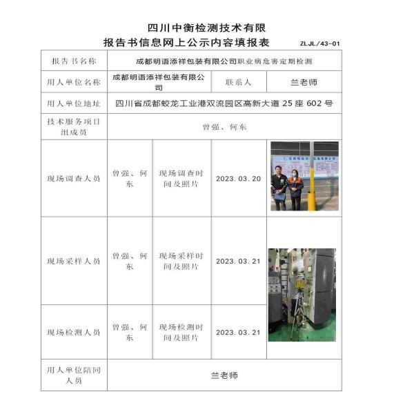 成都明語添祥包裝有限公司職業(yè)病危害定期檢測