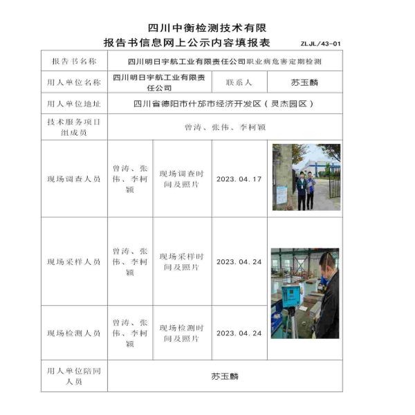 四川明日宇航工業有限責任公司職業病危害定期檢測