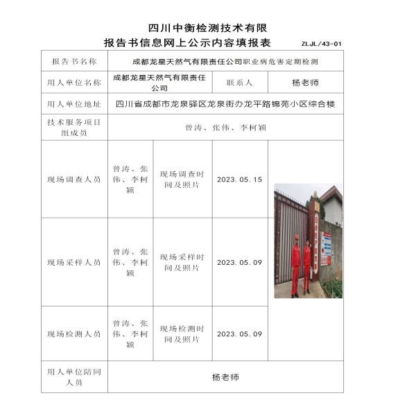 成都龍星天然氣有限責(zé)任公司職業(yè)病危害定期檢測